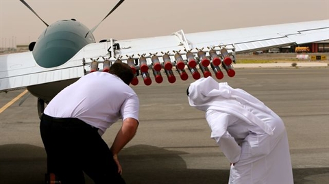 | Un pilote et un fonctionnaire des Émirats arabes unis vérifient sur un avion Beechcraft les fusées destinées à injecter des cristaux de sels dans les nuages pour tenter de provoquer de la pluie, le 23 avril à l'aéroport d'Al-Aïn |