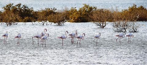 | Des flamands sur un plan d’eau de l’île de Sir Bani Yas, aux Émirats arabes unis. |