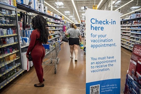 | Un panneau proposant de prendre rendez-vous pour se faire vacciner contre le COVID dans un supermarché de San Antonio, Texas, le 29 avril. |