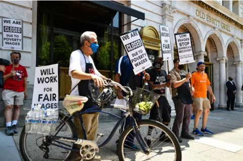 | Une manifestation d'employés de restaurants pour les salaires à Washington, le 26 mai. |