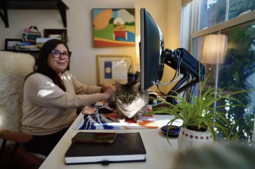 | Heather Happe, employée de DrFirst depuis près de 14 ans, et son chat Duncan, chez elle à Frederick, dans le Maryland, le 14 janvier. |
