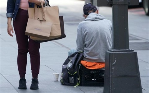 | Une passante sur la 5th Avenue à New York et une personne faisant l'aumône. Malgré la forte hausse des bas salaires aux États-Unis, les inégalités s'aggravent. |