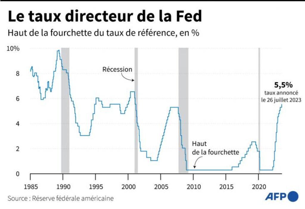 Depuis mars 2022, le principal taux directeur de la Fed a été relevé à 11 reprises, un rythme très rapide, destiné à juguler une inflation qui était au plus haut depuis plus de 40 ans.