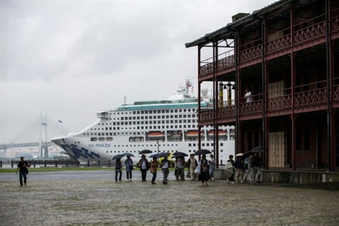 | Le bateau de croisière Sun Princess, appelé à servir d'"hôtel flottant", est amarré dans le port de Yokohama, le 16 juillet au Japon. |