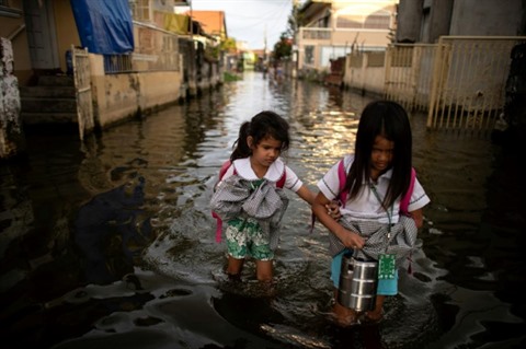 | Des écolières pataugent dans les eaux à Mabalacat (Philippines), en 2018. |