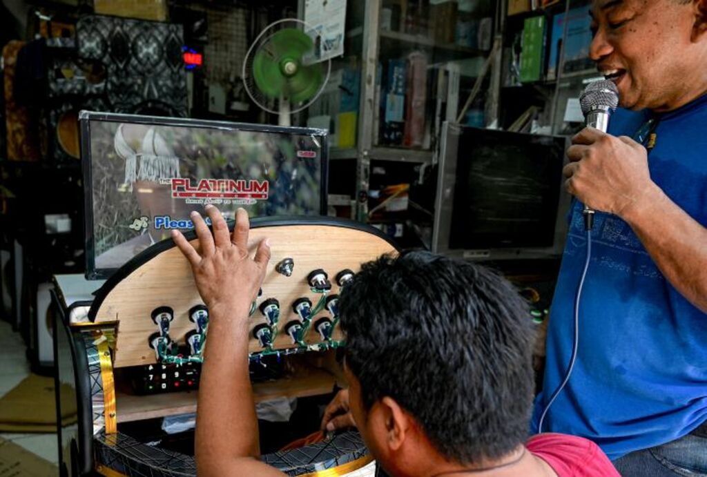 | Un homme (centre) teste une machine à karaoké dans une boutique de Manille, le 22 juillet aux Philippines. |