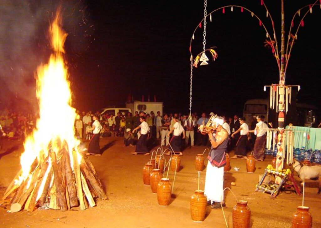 Profitant de la joie, de musique et de danse lors de la soirée de la fête Tơigum Pơtom, tout le monde, que ce soit vieux ou jeune, homme ou femme, mange des plats offerts par les esprits, en buvant du "rượu cân" la nuit dans la forêt, dansant et chantant au son passionné des gongs, des tambours "sơgơr" et du "rơkel".