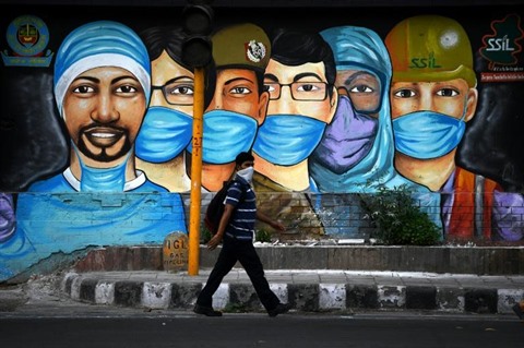 | Un homme passe devant une fresque de rue représentant des personnels luttant contre le coronavirus, le 14 juillet 2020 à New Delhi. |