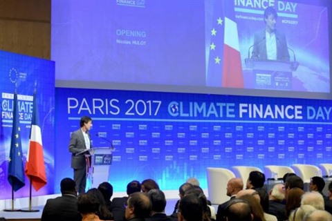 | Le ministre français de la Transition écologique Nicolas Hulot s'adresse aux entreprises et acteurs mondiaux de la finance, à Paris le 11 décembre. |