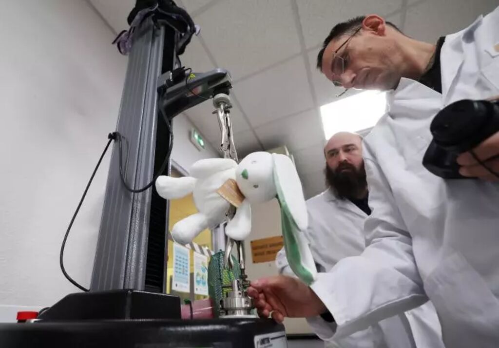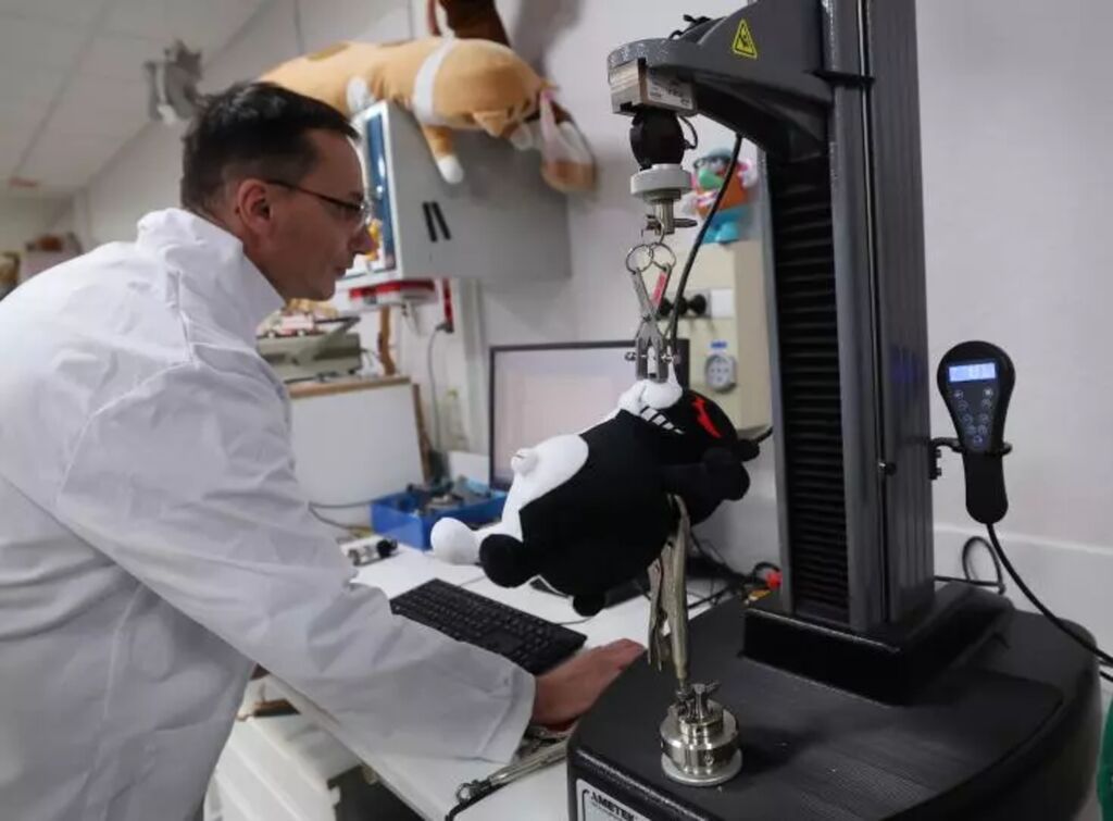 Nicolas, technicien au sein du domaine jouets du laboratoire, soumet les peluches à des "essais de traction", explique-t-il. Pour être aux normes, les éléments amovibles de l'ourson (yeux, nez) doivent résister à une pression de 90 newtons, soit environ 9 kg, "la force que peut générer un enfant".