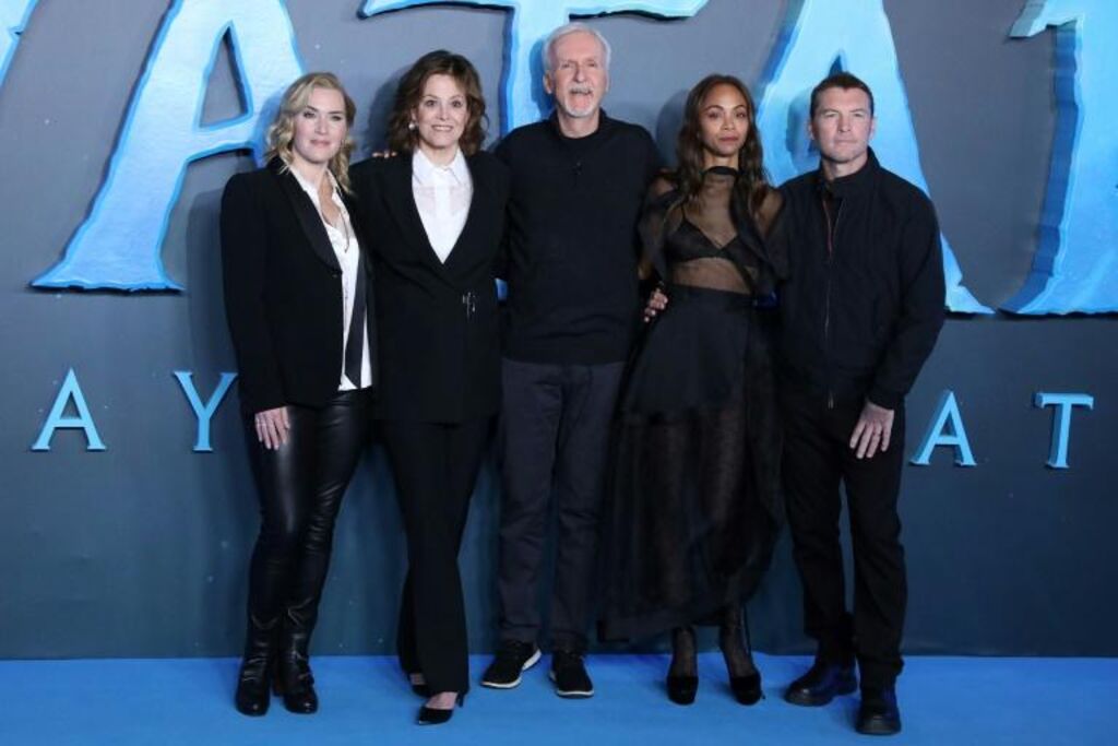 | De gauche à droite : les actrices Kate Winslet et Sigourney Weaver, le réalisateur James Cameron, les acteurs Zoe Saldana et Sam Worthington, le 4 décembre à Londres. |