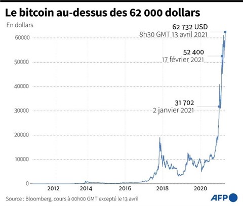 | Le bitcoin a atteint un plus haut historique à plus de 62.000 USD le 13 avril, à 8h30 GMT |
