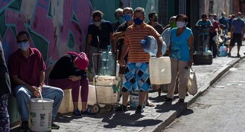 | Des Vénézulién(nes) à Caracas remplissent leurs bidons d’eau comme ils le peuvent. |