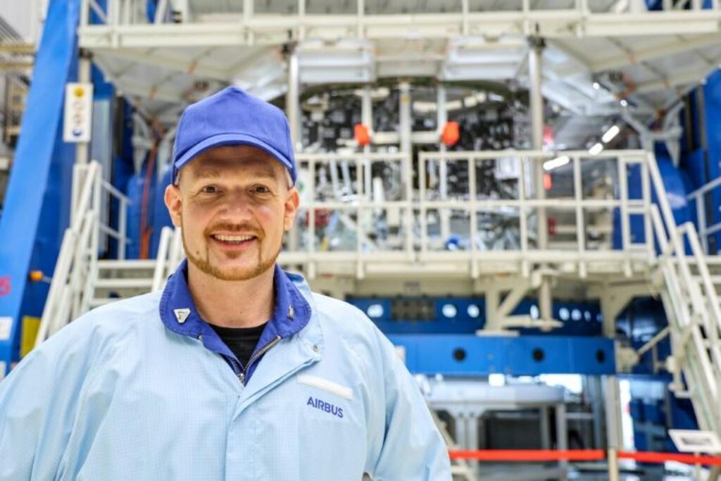 | L'astronaute allemand Alexander Gerst pose devant le module de service européen Orion 4 (ESM-4) sur le site d'assemblage d'Airbus Défense à Brême, le 9 février en Allemagne. |