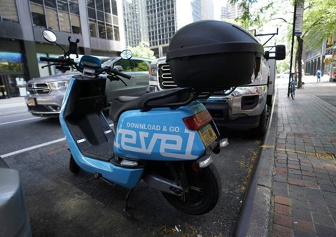 | Un scooter électrique en partage du réseau Revel, à New York, le 30 juillet. |