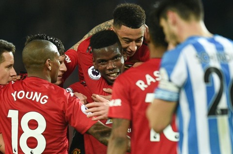 | Paul Pogba (centre) fêté par ses coéquipiers avoir avoir marqué contre Huddersfield, le 26 décembre à Manchester. |