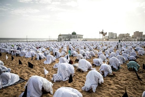 | Des musulmans portant des masques prient sur une plage devant la mosquée Yoff Layene, à Dakar au Sénégal le 24 mai. |