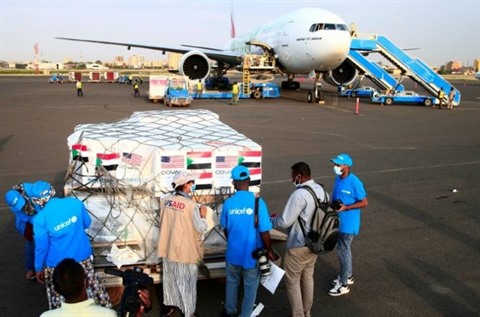 | Arrivée d'un lot de vaccins au Soudan via le système Covax le 6 octobre 2021. |