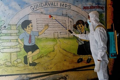 | Un agent désinfecte un mur d'une école avant sa réouverture, à Bombay, le 23 janvier. |