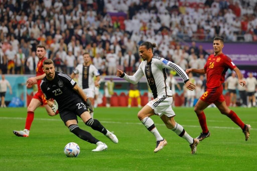 | L'Allemand Leroy Sané (centre) devant le gardien espagnol Unai Simon (gauche) au Mondial, le 27 novembre à al-Khor. |