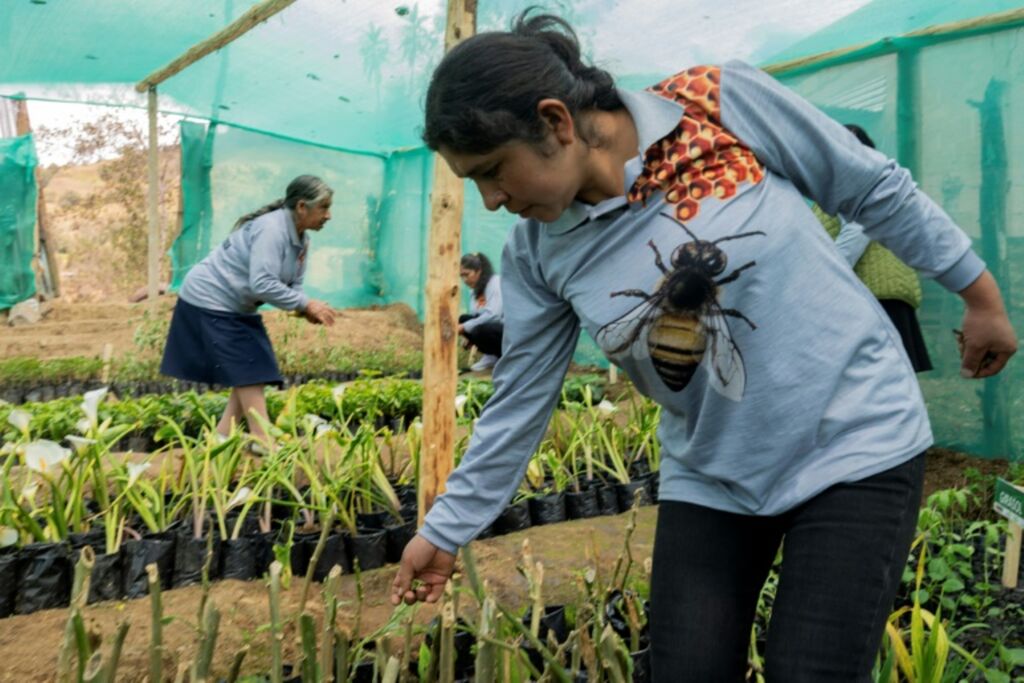 | Des apicultrices de l'association Hojuelas de Miel, dans leur pépinière à Chilal de La Merced, au Pérou. |