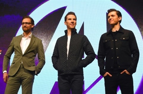 | Les acteurs Tom Hiddleston, Benedict Cumberbatch et Tom, lors de la promotion du film +Avengers: Infinity war+ le 12 avril à Séoul. |