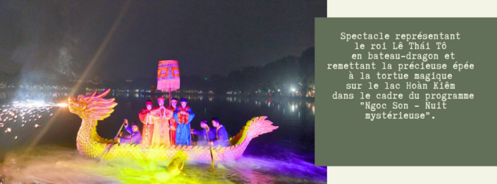 Le point culminant de cette visite nocturne est le spectacle représentant le roi Lê Thái Tô (1385-1433) en bateau-dragon sur le lac Hoàn Kiêm, remettant la précieuse épée à la tortue magique.