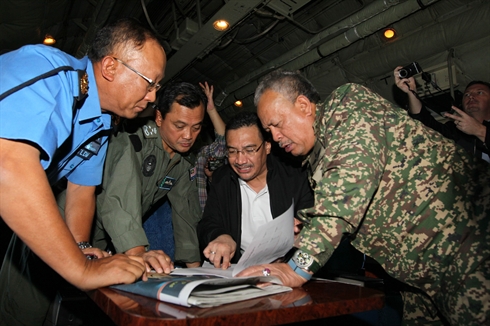 | Le ministre par intérim des Transports de la Malaisie, Hishamuddin Hussein (2e à droite), et le chef des forces armées malaisiennes Zulkifeli Mohd Zin (droite), le 11 mars dans l'État de Selangor (Malaisie). |