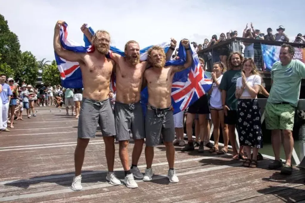 | Les frères Lachlan, Jamie et Ewan MacLean à leur arrivée de la traversée du Pacifique à la rame, le 30 août à Cairns en Australie. |