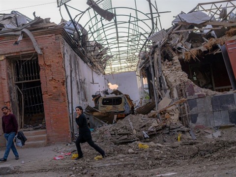 | Une rue touchée par un missile à Gandja, ville d'Azerbaïdjan proche de la région disputée du Nagorny Karabakh, le 8 octobre 2020. |