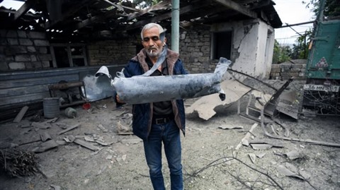 | Un homme montre un fragment d'obus dans la cour de la maison de son frère endommagé par des bombardements lors des combats entre l'Arménie et l'Azerbaïdjan. |