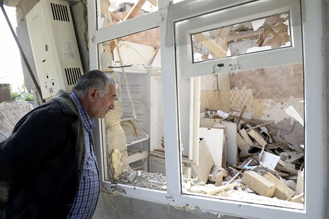 | Une maison touchée par des tirs d'artillerie dans le village azerbaïdjanais de Shukurbayli, proche de la région disputée du Nagorny Karabakh, le 8 octobre. |