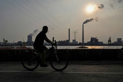 | Promenade à vélo en Chine le long du fleuve Huangpu, près de la centrale électrique au charbon de Wujing, à Shangaï, le 28 septembre. |