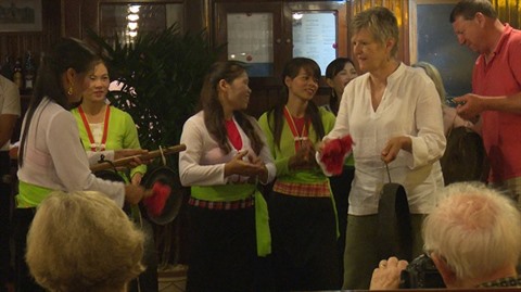 | Des voyageurs étrangers jouent des instruments musicaux traditionnels au salon de la musique Ba Phô. |