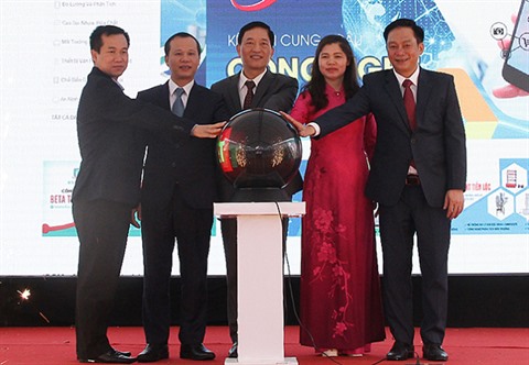 | Le vice-ministre des Sciences et des Technologies, Trân Van Tùng (centre) lors de la cérémonie d'inauguration d'une plateforme virtuelle de commerce de technologies et équipements de la province de Bac Giang. |