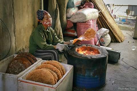 | Une femme du village de Thô Hà en train de griller ses "bánh đa". |