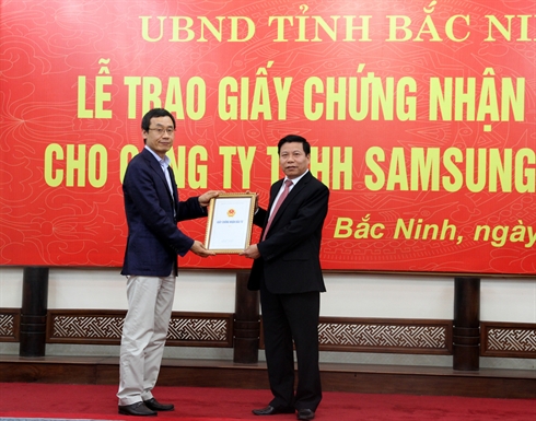 | Cérémonie de remise d'une licence d’investissement à la Sarl Samsung Display, mercredi 2 juillet à Bac Ninh (Nord). |
