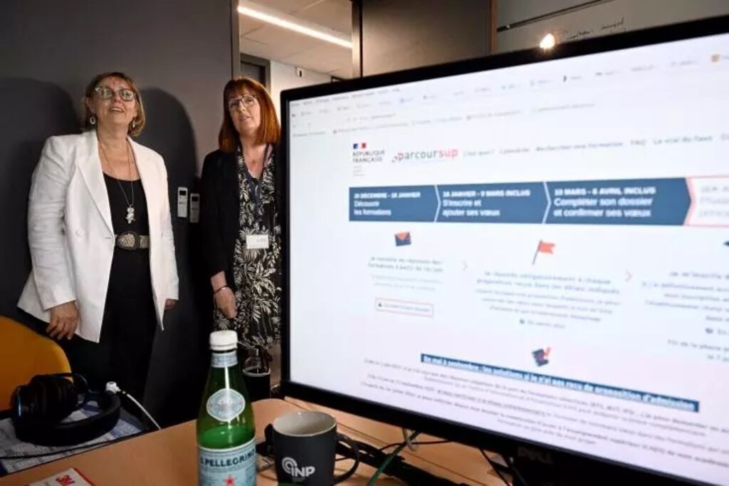 | La ministre de l'Enseignement supérieur et de la Recherche, Sylvie Retailleau (gauche), visite le siège de Parcoursup à Toulouse, dans le Sud-Ouest de la France, le 12 juin. |