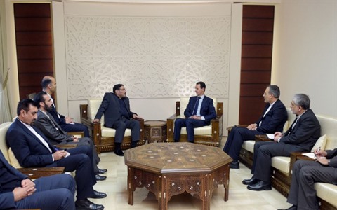 | Photo diffusée par l'agence officielle Syrian Arab News Agency (SANA), le 8 janvier à Damas du président syrien Bachar al-Assad (CD), en discussions avec le secrétaire iranien du Conseil suprême de sécurité nationale. |