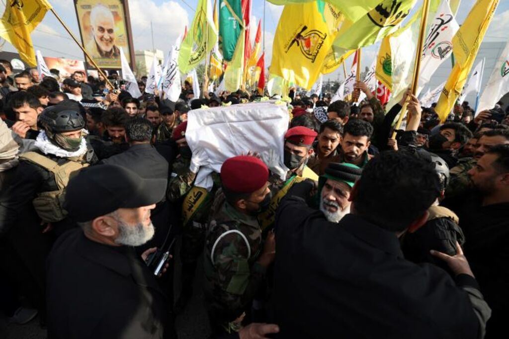 | Des membres des forces du Hachd al-Chaabi portent le cercueil d'un camarade tué dans des frappes américaines en Irak, lors de ses funérailles au QG du Hachd al-Chaabi à Bagdad, le 25 janvier. |