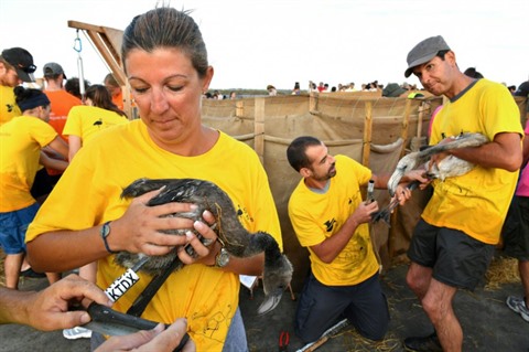 Le soleil se lève à peine à l’horizon. Lorsque les humains habillés de T-shirt de couleurs vives s’approchent des quelque 900 poussins gris, les flamants roses adultes qui gardaient cette "crèche", s’envolent à tire-d’aile vers les remparts dorés d’Aigues-Mortes (Gard, France). "Allez, on se bouge!", lance Pierre, responsable de l’équipe "jaune" des bénévoles qui, les jambes plongées dans l’eau chargée de sel, dirigent les poussins apeurés vers un enclos arrondi, composé de toile de jute et de bois, dressé au bord de l’eau.