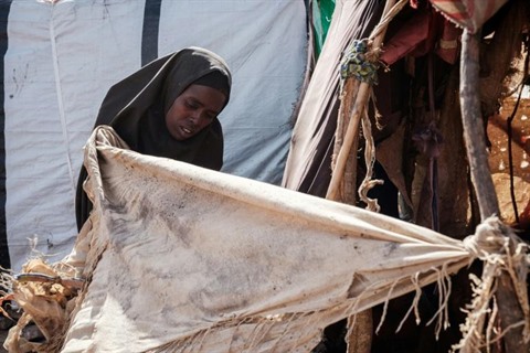 | Salado Adan Mohamed, 26 ans et mère de trois enfants, arrange son abri de fortune dans le camp de déplacés de Muuri à Baidoa (Somalie), le 13 février. |