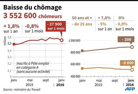 | Évolution mensuelle du chômage de janvier 2015 à janvier 2016, chiffres jeunes et seniors. |