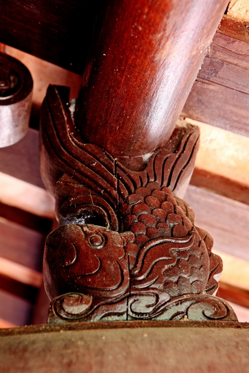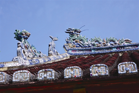 | Le toit de la maison communale de Thu Lê est orné de dragons, phénix et tortues. |
