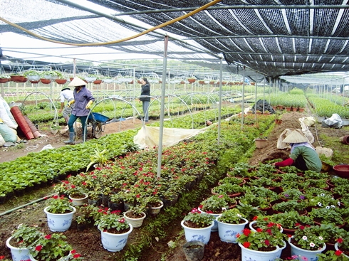 Vu de la digue, le terrain de Nguyên Thi Thom, dans la commune de Phung Công, a l’allure d’un chantier. Plus d’un mois avant le Têt, des camionnettes y chargent du matin au soir des plantes en pot. Mme Thom a embauché une dizaine de travailleurs supplémentaires. Elle cultive chrysanthèmes, lantaniers (Lantana camaran, ngu sac en vietnamien) et rosiers sur 1.100 m2. D’après Nguyên Van Hai, un client régulier, le prix est de 30.000 dôngs/pot mais pour le Têt, il grimpe à 80.000-100.000 dôngs. Les commandes sont passées deux mois à l’avance.