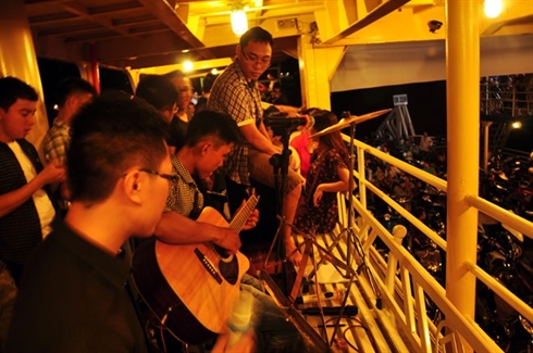 | Les guitaristes se produisent lors du minishow baptisé «Mémoire de Ha Long» et organisé sur la ligne nocturne du bac reliant Hon Gai à Bai Chay. |