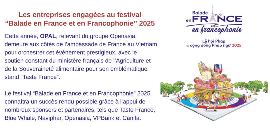“Balade en France”, le plus grand festival de la gastronomie française, a réussi lors de ses quatre précédentes éditions organisées à Hanoï en 2018, 2020, 2023 et 2024. L’an dernier, il a attiré près de 400.000 visiteurs autour de la gastronomie française, de spectacles et des Jeux olympiques et paralympiques de Paris, alors que la Course de la Francophonie, combinée avec un salon de l’orientation francophone, a réuni 1.800 participants et plus de 2.000 visiteurs.