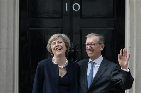 | Theresa May devant le 10 Downing Street avec son mari Philip John, le 13 juillet, lors de sa prise de fonction comme Première ministre britannique |