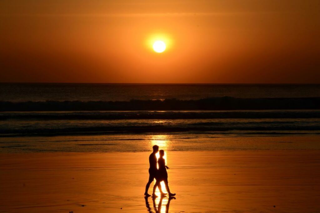 | Des promeneurs sur la plage de Kuta beach à Bali, près de Denpasar. |