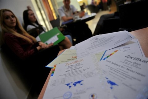 | De jeunes Bosniens patientent avant un cours d'allemand à Tuzla, dans le Nord-Ouest de la Bosnie. |
